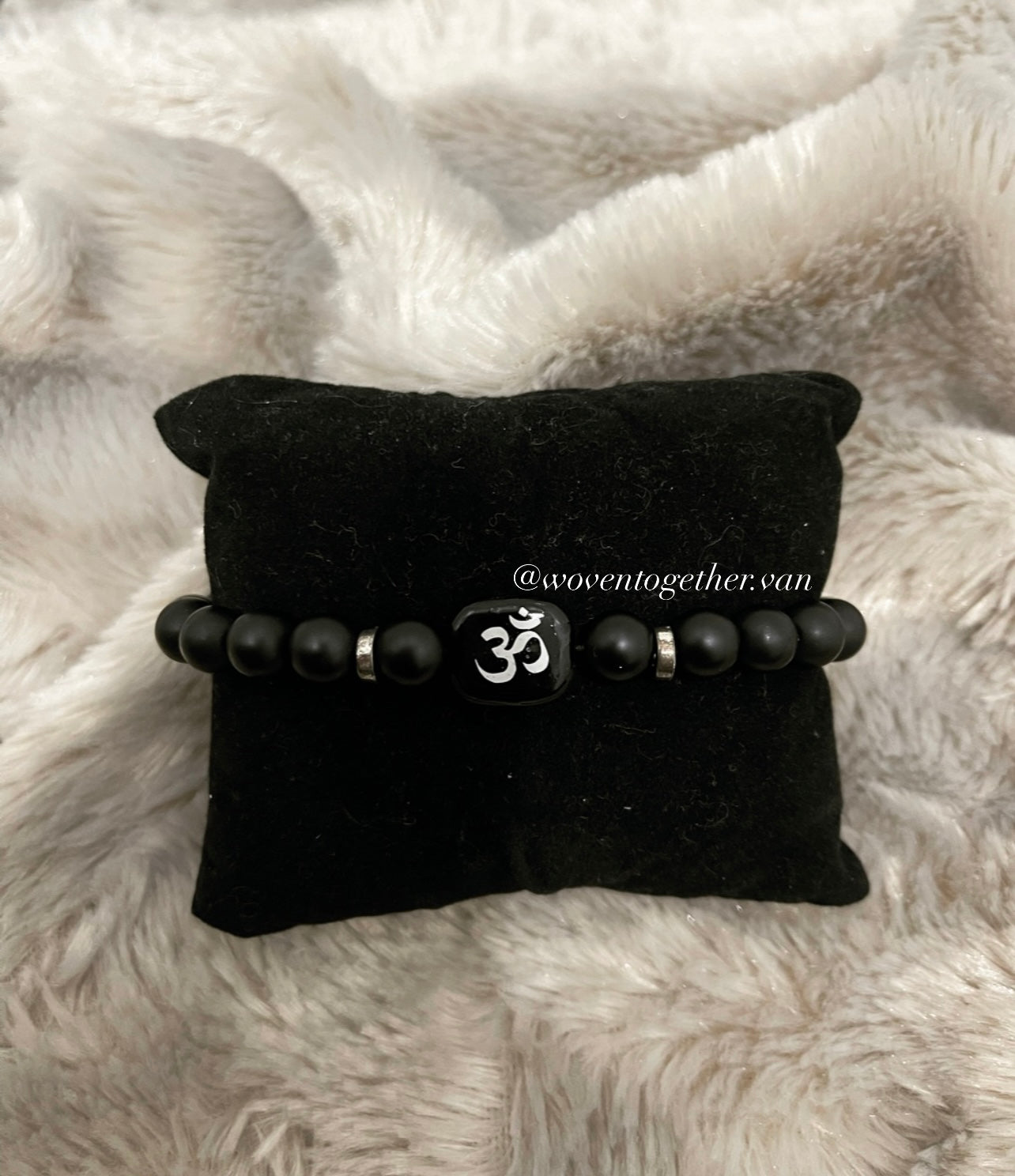 This hand-crafted bracelet is made with a vinyl printed white religious ohm symbol. Please pick the bead colour and size you would like.