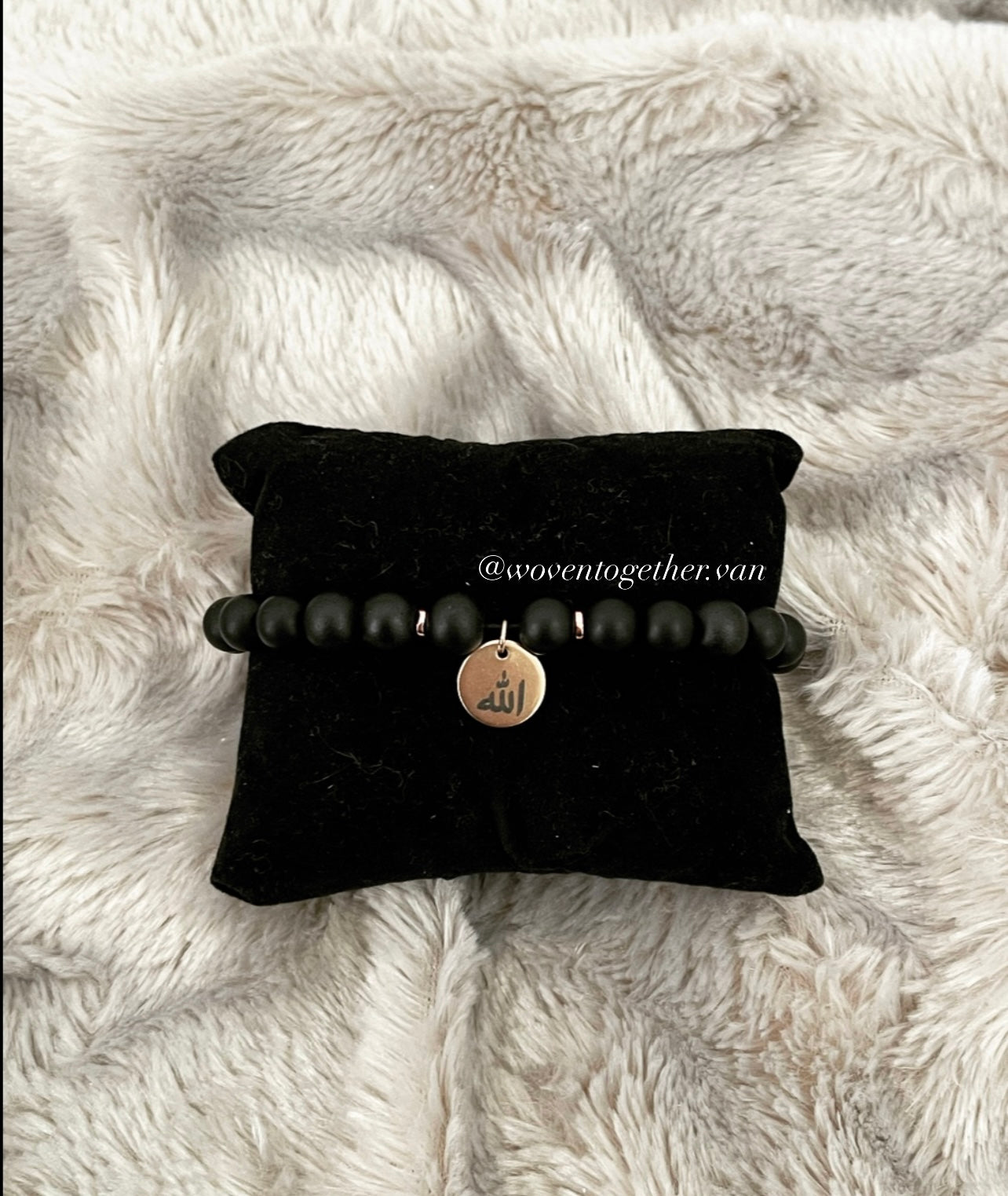 This hand-crafted bracelet is made with an engrave rose gold religious Allah charm. Please pick the bead colour and size you would like.