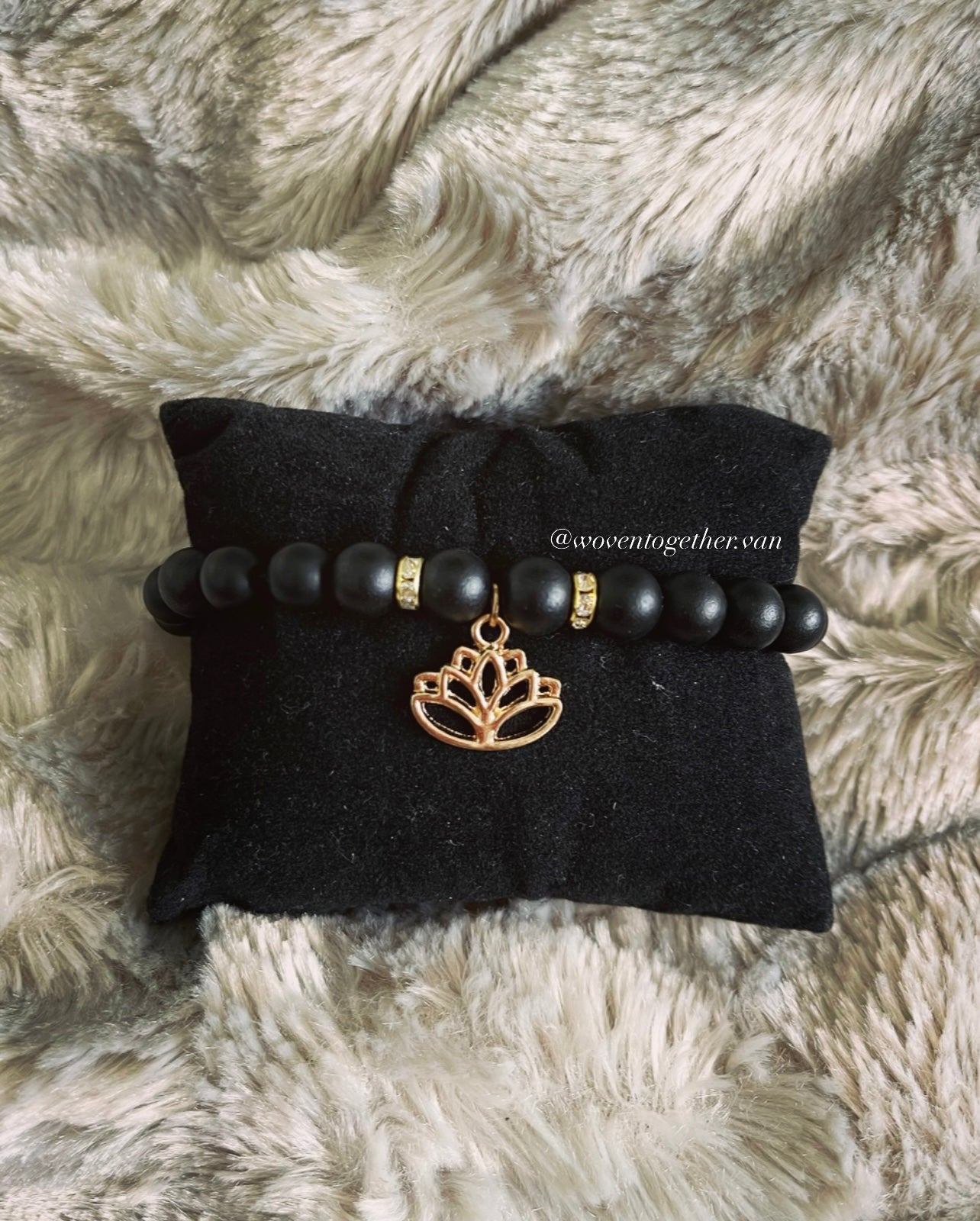 This hand-crafted bracelet is made with a gold lotus. Please pick the bead colour and size you would like.